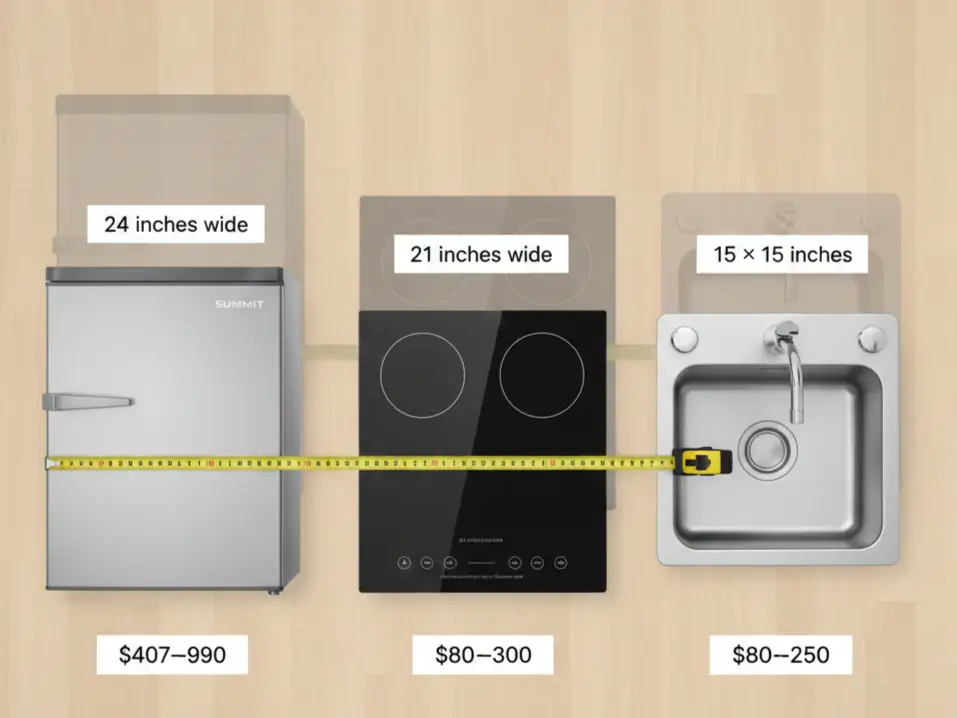 Standard appliances won’t fit. Look for apartment-size refrigerators (10 to 18 cubic feet, 24 inches wide), two-burner cooktops (12 to 21 inches), and bar sinks (15 to 22 inches). Expect to spend $800 to $2,500 on core appliances. Induction cooktops save space and improve safety in tight quarters.